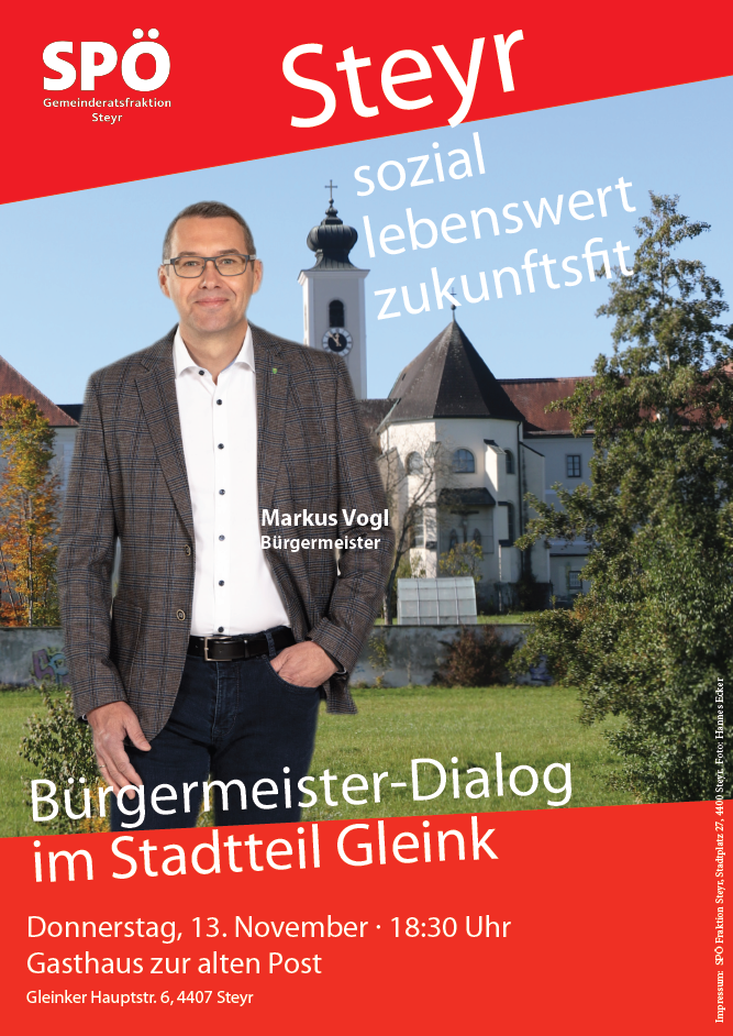 Steyr. Die SPÖ setzt die Reihe der Bürgermeister-Dialoge fort: Nach Abenden am Resthof und in Münichholz ist Stadtchef Markus Vogl nun in seinem Heimat-Stadtteil präsent: Am Donnerstag, 13. November, gibt es im Gasthaus zur alten Post in Gleink ab 18:30 Uhr die Möglichkeit, Ideen auszutauschen und Anliegen zu besprechen.
